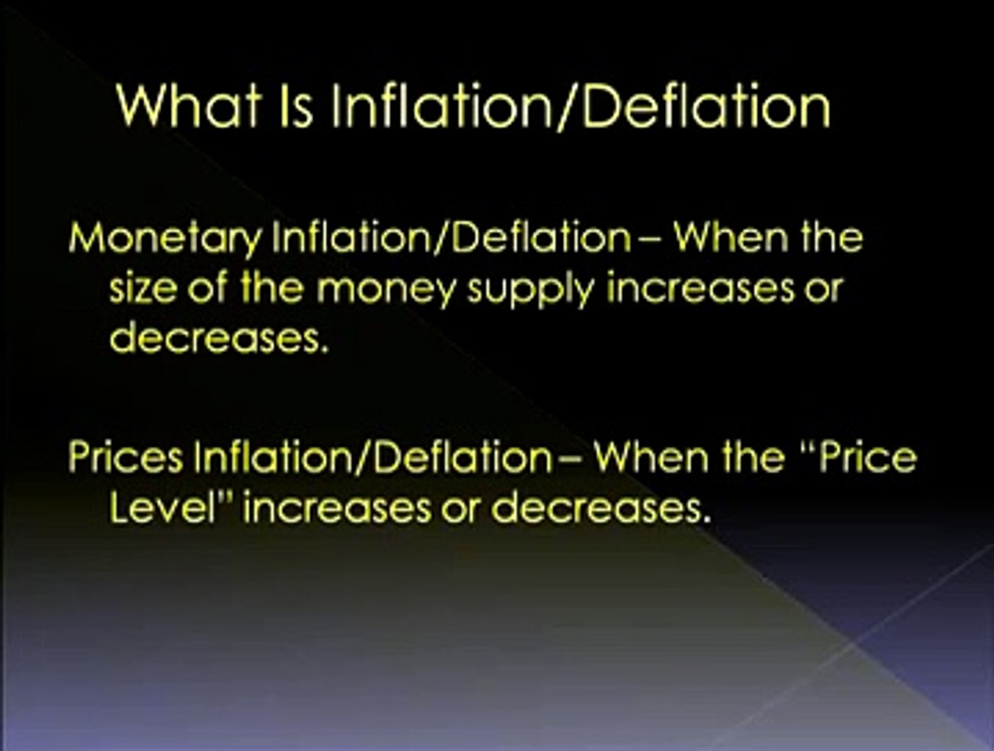 Inflation may be defined as a rise in price level of all commodities in deflation is characterized by a falling tend in the general price level. In a recession there can be two triggers: Inflation is when prices rise, and deflation is when prices fall. Inflation occurs when the prices of goods and services rise, while deflation occurs when those prices decrease. In my humble opinion, inflation, and its counterpart, deflation, are the most important topics in economics.